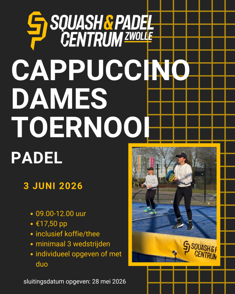 Op woensdagochtend 3 juni organiseren we weer een gezellig Cappuccino Dames Toernooi. Een speciaal padeltoernooi voor vrouwen die niet alleen houden van een fanatiek potje padel, maar ook van een ontspannen en gezellige ochtend op de baan.