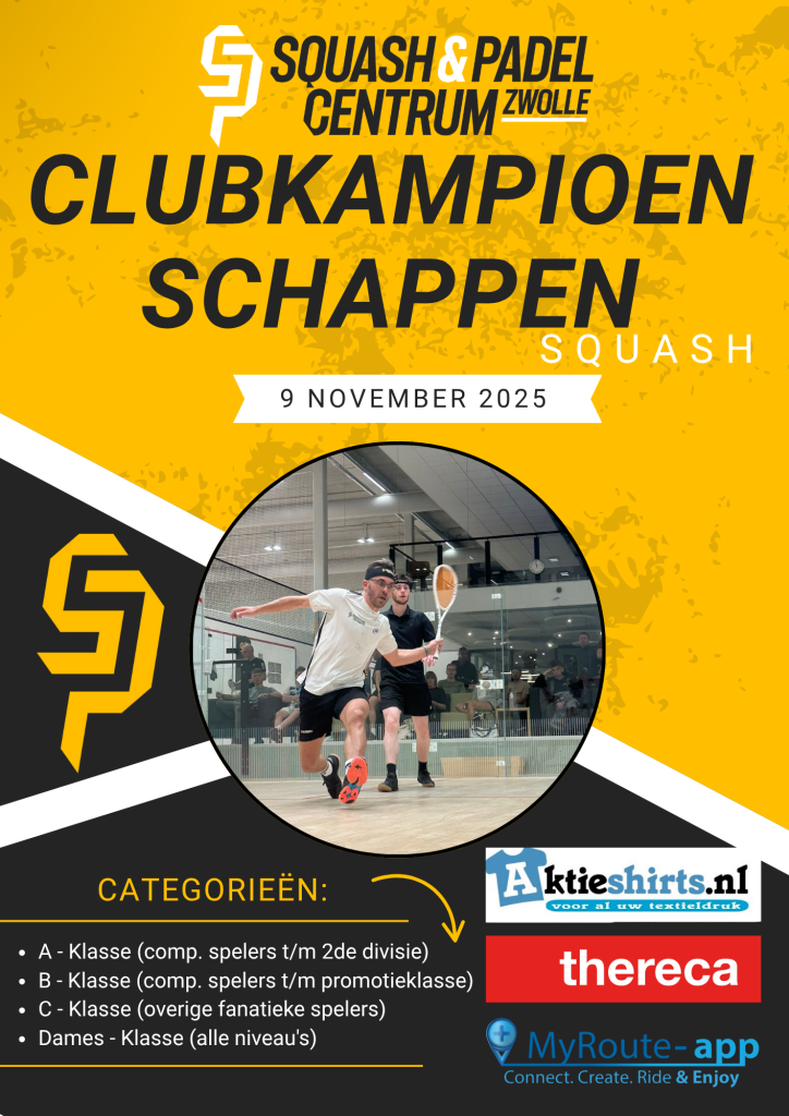 Na een paar jaar van afwezigheid keren de Clubkampioenschappen Squash eindelijk terug bij Squash & Padel Centrum Zwolle! Op zondag 9 november 2025 gaan we samen de baan op om te strijden voor de titel van clubkampioen.