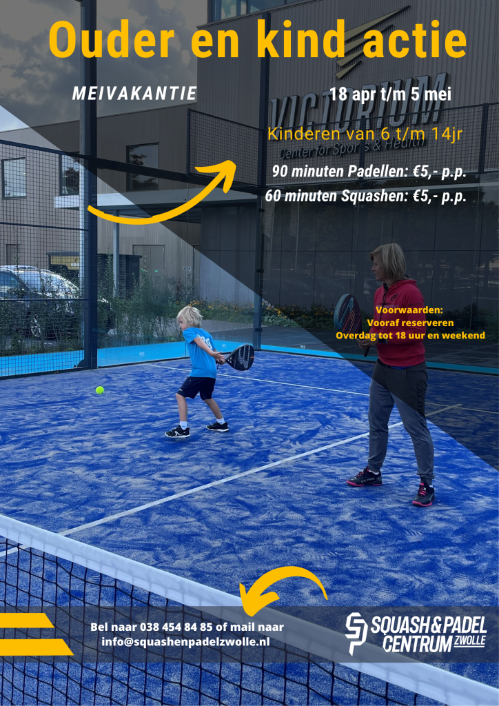 Ook in de meivakantie (van 18 april tot en met 5 mei) is er weer een ouder & kind actie bij Squash & Padel Centrum Zwolle. Wil jij graag een sportief uitje in de (mei)vakantie? Dan is dit zeker een aanrader! Je kunt namelijk tegen een gereduceerd tarief squashen of padellen (incl. materiaal).